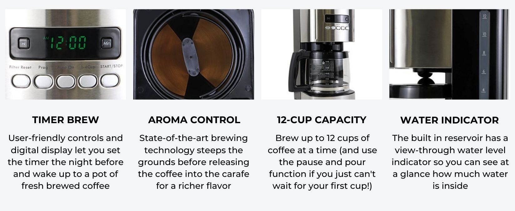 - 💧 Includes Water Purifier and Reusable Filter: This 12-cup coffee maker features a charcoal water filter to remove impurities from tap water, along with a reusable gold-tone cone filter that's both eco-friendly and budget-friendly.