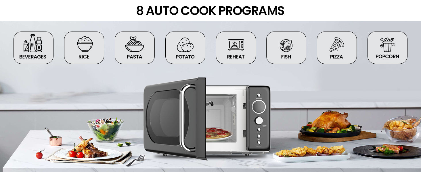 The compact countertop design makes this retro microwave oven ideal for small kitchens. Although it takes up minimal space, it doesn’t compromise on performance. Because of its efficient heating technology, you can enjoy evenly cooked meals every time. Additionally, the user-friendly interface ensures that anyone in your household can operate it effortlessly.